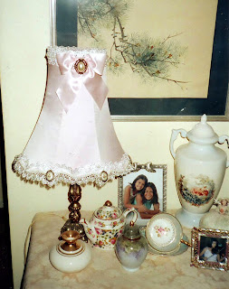I decided to re-do it exactly but in a pale pink pure silk and replace the trim which was ivory (and tobacco) with the same in white. I had just enough to do both top and bottom. The buttons also got the Fabreeze treatment. I don't turn it on often because I'm not sure how safe the wiring is and the only globe that doesn't burn the fabric is one from a sewing machine.